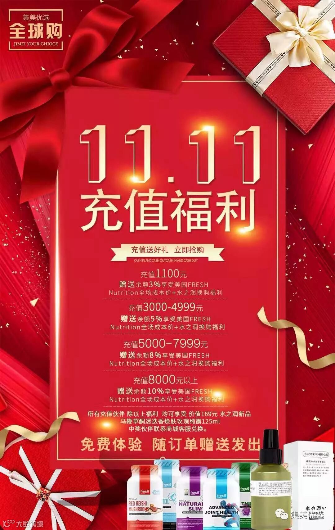 本次双十一充值除了大家最喜欢的送余额, 还有美国FRESH Nutrition保健品成本价体验和水之润换购权益,以及新品免费试用 【仅限1000名】