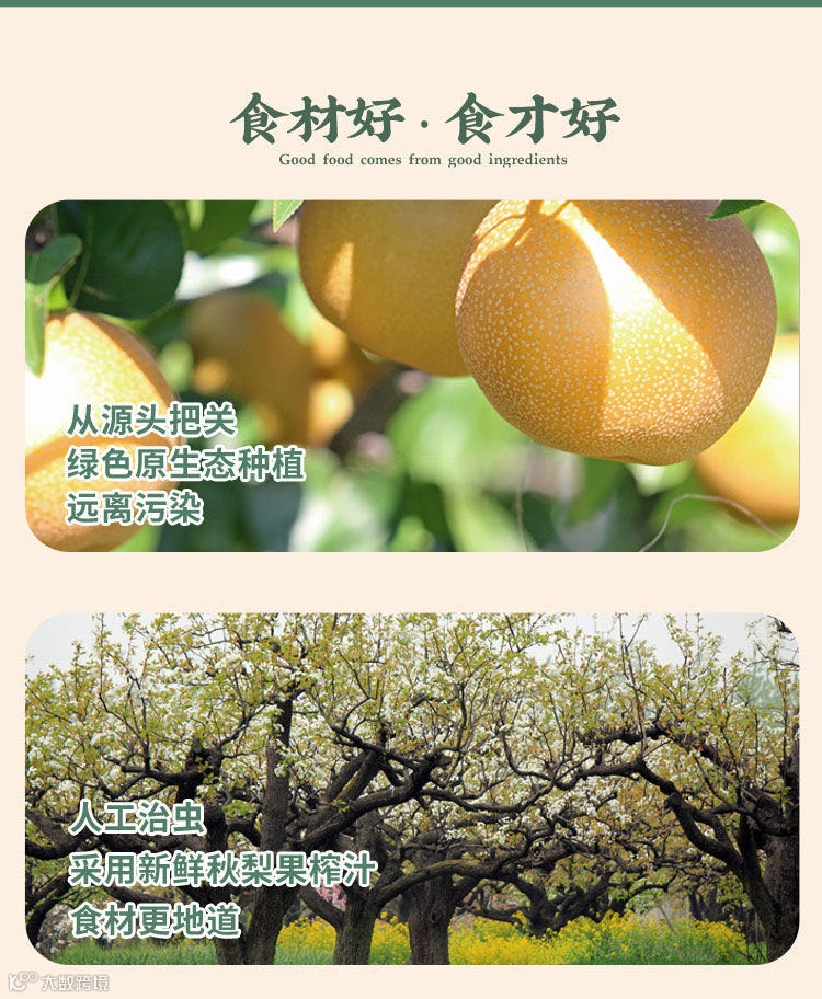 在原料方面,采用了新鲜秋梨果榨汁。它所含绿原酸含量远高于其他梨类,清甜爽口。