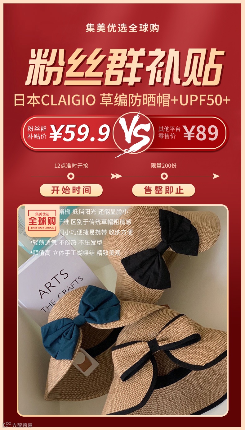 【粉丝群补贴】 日本CLAIGIO 草编防晒帽+UPF50+ 三色可选 原价:89元 粉丝群补贴价:59.9元