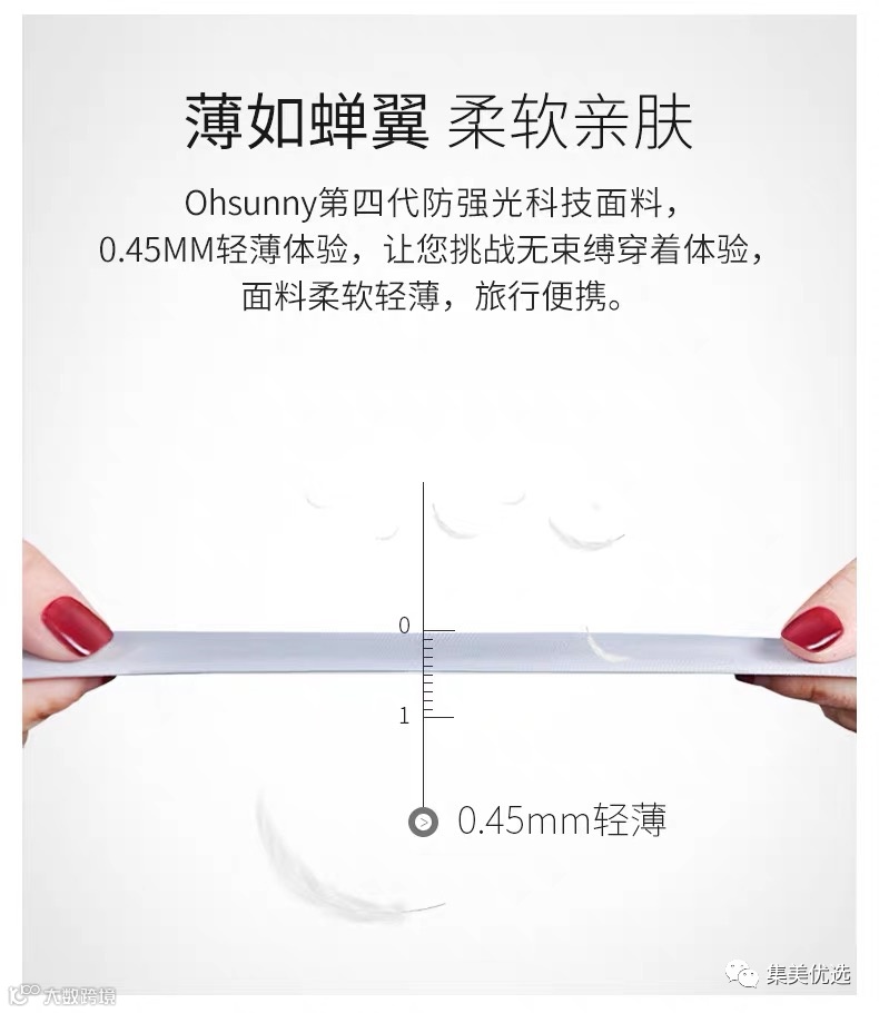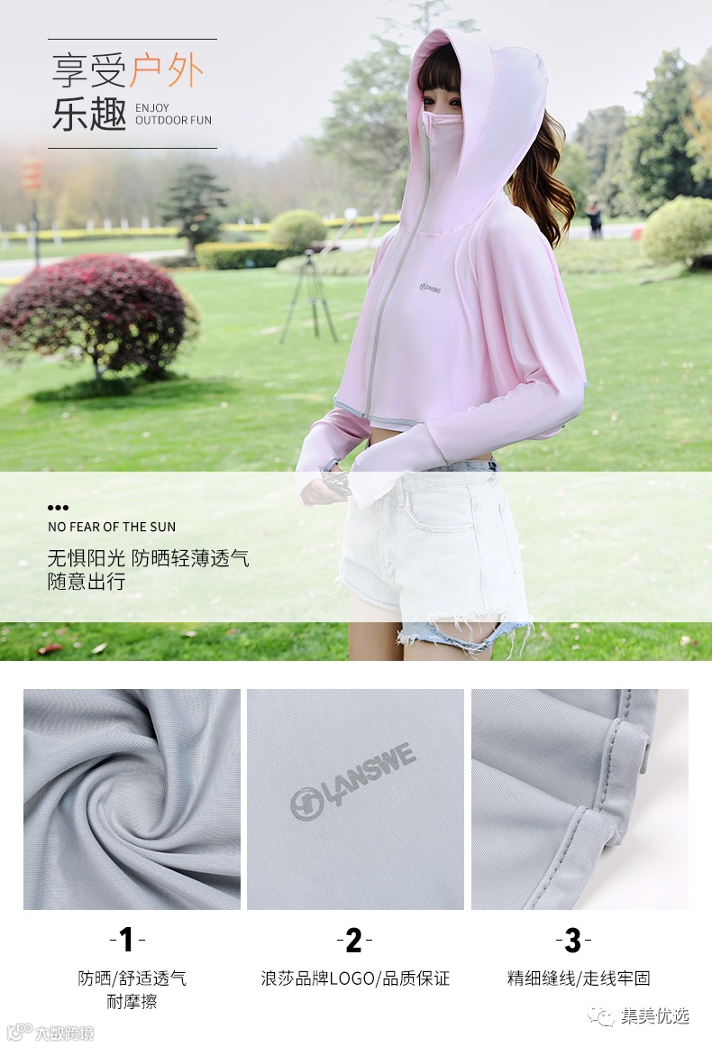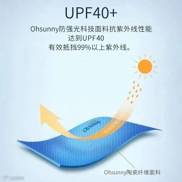 采用Ohsunny全新强光防晒面料,防晒指数达到UPF40+,有效遮蔽99%以上紫外线,秒杀普通防晒衣~