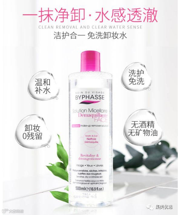 这款卸妆水含Micelle胶束微粒,能将皮肤表面里层的污渍溶解吸出,各种彩妆都能卸得非常干净,而且很方便:日常妆容一抹就搞定。防水彩妆、睫毛膏、防水眼线、唇彩等,湿敷15秒,再一抹就搞定。并且成分温和,眼唇可用,保湿养肤。
