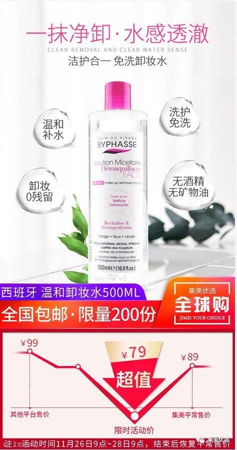 【福利团购】西班牙BYPHASSE蓓昂斯深层洁净温和卸妆水500ml