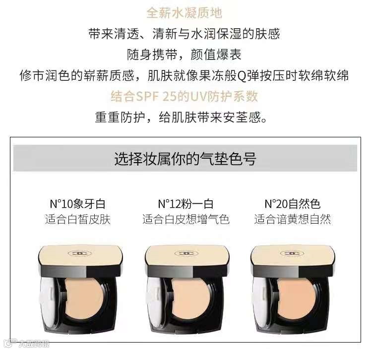 香奈儿果冻气垫,俗称“行走的水光针”香奈儿果冻气垫!水润必选啊。妆效是那种透光的水光肌,像喝饱了水嘭起来的水润光感??皮肤又白又亮水嘟嘟的,干皮福音. 颜值高,轻薄水润,保湿服帖!