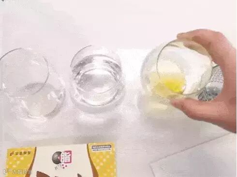 将吃油丸“暴风”切碎,再将油倒入清水里,可以看见水面上漂浮着大大小小的油花,再把切碎的吃油丸倒入看起来油腻腻的水油混合物里。
