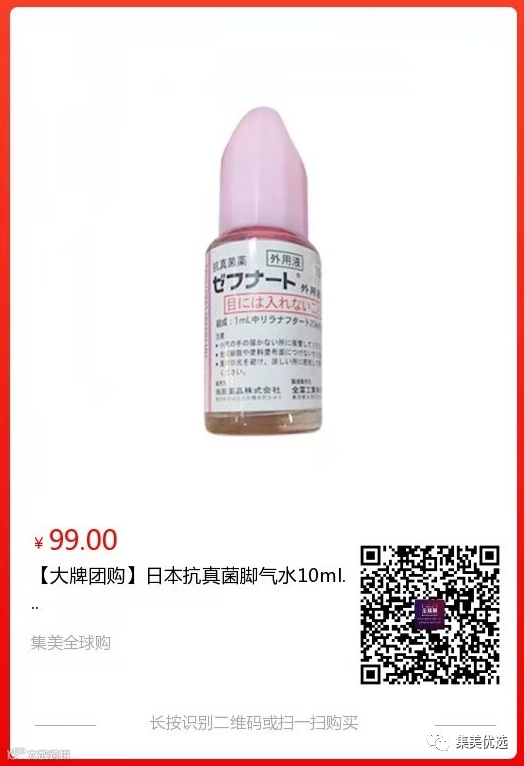 【大牌团购】日本抗真菌脚气水10ml 原价:109元 SVIP福利补贴价:89元 脚气,是足癣的俗称,也被称为“香港脚”。系真菌感染引起,具有传染性,夏秋多发,常表现为皮下水疱、趾间糜烂、渗流滋水及角化过度、脱屑、瘙痒等,其皮肤损害往往是先单侧(即单脚)发生,数周或数月后才感染到对侧。根据其皮损特点,分为三种类型:水疱型、糜烂型和脱屑型。