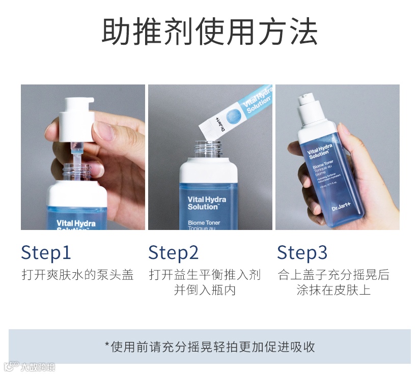 使用爽肤水之前需要将益生助推剂倒入爽肤水里,是100%的粉质精华哦! 摇一摇均匀之后再用,这么做的目的是维持益生稳定,充分发挥他们的作用。