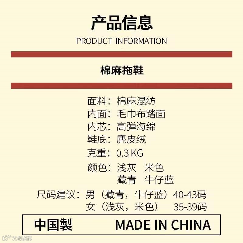 原料材质:面料:棉麻混纺、内里面料:毛巾布踏面、