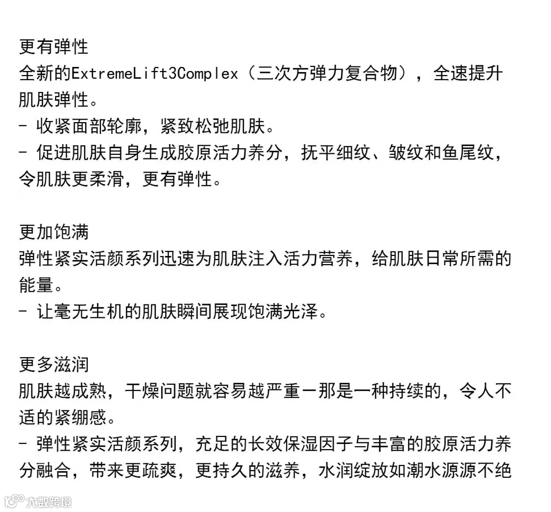 新升级多肽配方结合了三种科技,和老款面霜有一定的差别哦~雅诗兰黛独创的ExtremeLift3Complex(三次方弹力复合物),令肌肤短时间内恢复饱满紧实。充足的长效保湿因子与丰富的胶原活力养分融合,令肌肤瞬间展现活力光彩。