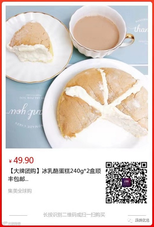 【大牌团购】冰乳酪蛋糕240g 2盒 顺丰包邮 原价:69元 SVIP福利补贴价:49.9元 人们对甜食的喜爱是刻在基因当中的