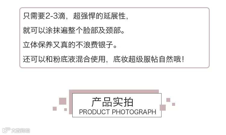 【1】任何化妆品都无法排除过敏现象,首次使用前需做过敏测试,取产品绿豆大小抹于耳背或手腕处,停留15-30分钟,擦干净24小时后无红肿现象方可使用。