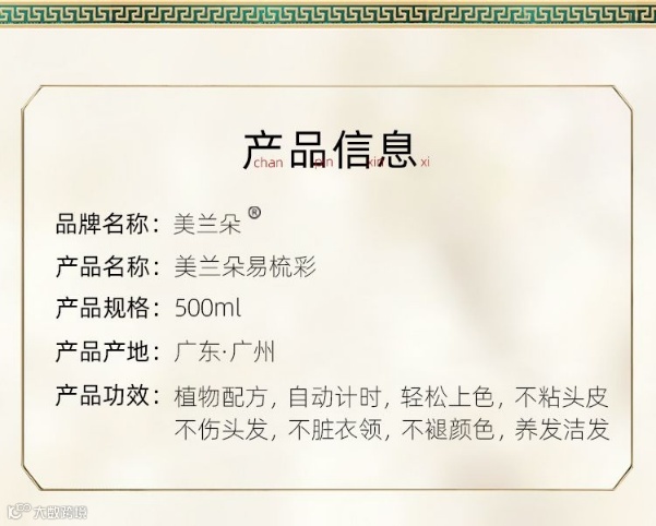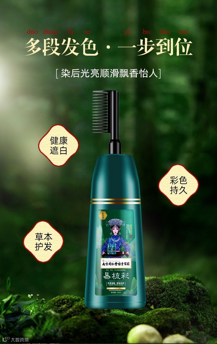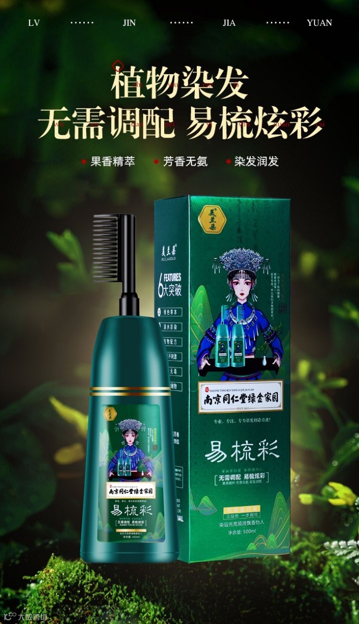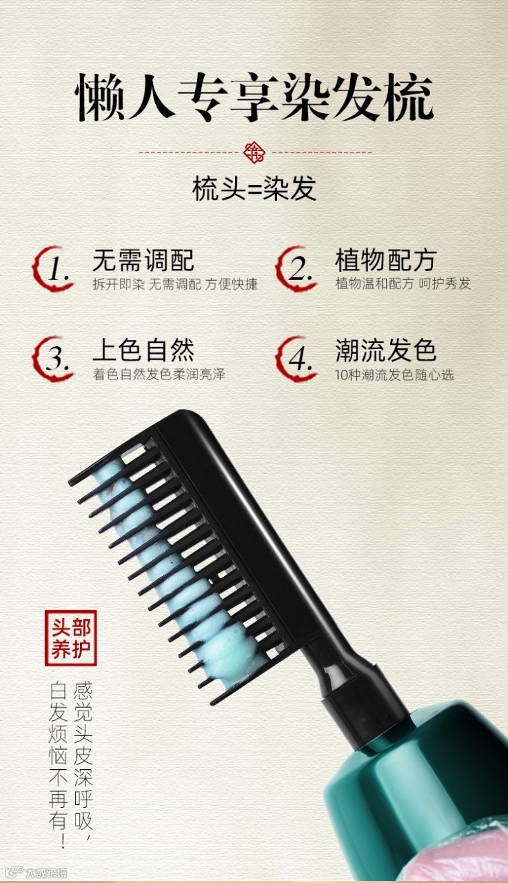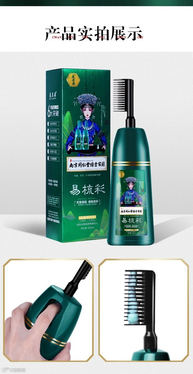 咱们这款产品运用绿色无氨无刺激酸性温和配方,染后芳香怡人,不伤头发,无铅,无毒,不沾头皮,完美遮盖白发,帮助色素因子渗入发芯,使头发色泽更饱满,更健康。