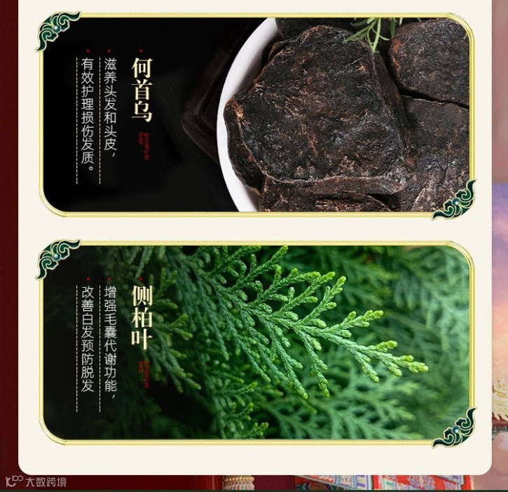 全新草药植物生态配方,给您与众不同的新体验,萃取何首乌,侧柏叶,生姜,番泻叶,枸杞,抗白菊,丁香,玛卡,当归,人参等植物成分。