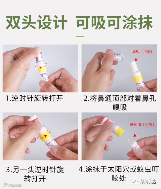 采用独特的一管两用设计,上吸下涂,带药膏的一头可插入鼻中吸闻气味,缓解鼻塞不通以及头晕昏眩, 而带药水的一头可外涂皮肤上,能消肿止痛,舒缓止痒。。。