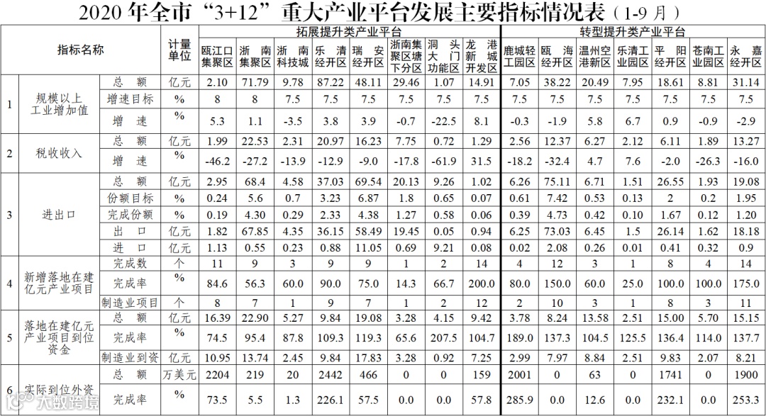 2020年全市“3+12”重大产业平台发展主要指标情况表(1-9月)