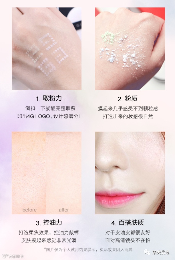 所以集美给你推荐纪梵希四宫格散粉,有吸收面部多余油脂的作用,不仅能帮助持妆,还能使妆容看上去更为柔和,呈现雾感朦胧的美态。
