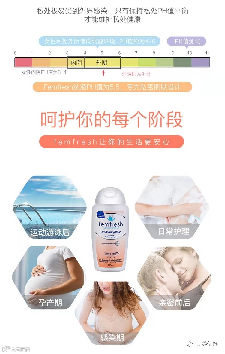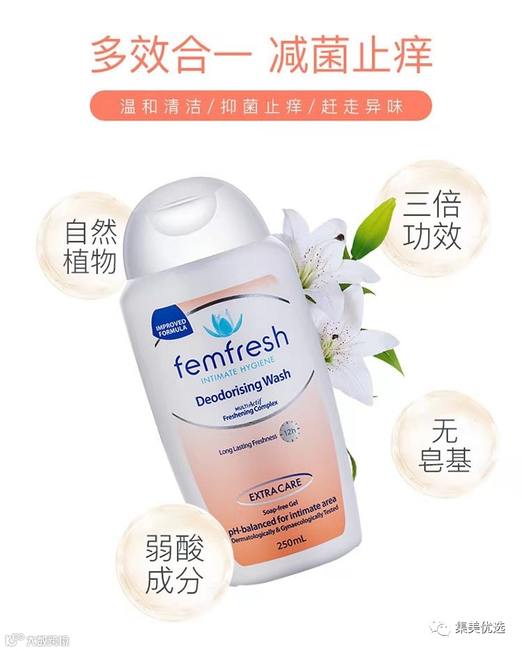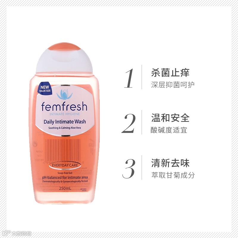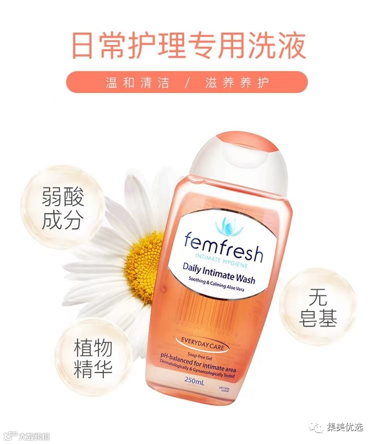 femfresh芳芯私处护理液不同于普通肥皂及沐浴露,富含滋润成分及植物提取物,很温和,有去异味、保湿、抑菌、舒缓的功效。让你私处变得健康!!达到保护私处的作用!
