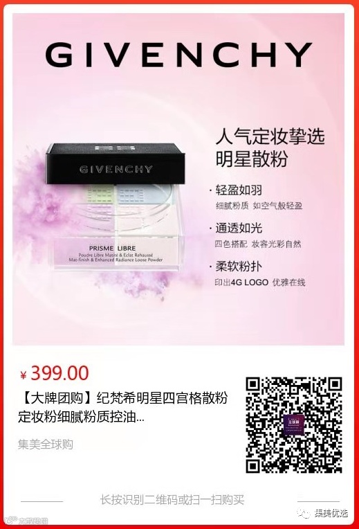 【大牌团购】纪梵希明星四宫格散粉 #1慕斯淡彩(不带闪) 原价:550元 SVIP福利补贴价:399元 在化妆界,有一种撩人的妆容叫“伪素颜”。