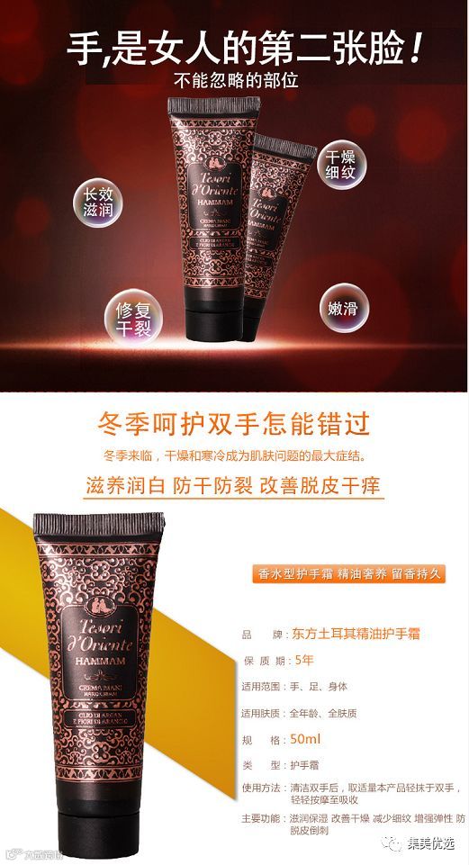 土耳其东方宝石护手霜内含摩洛哥坚果油(阿甘油),淡淡的花香,有效滋润您的双手。清爽滋润双手肌肤,促进肌肤新生,改善干燥不适现象,呵护您的肌肤质地轻盈的乳液状质地给您肌肤带来柔滑细腻的感受,并且乳香分子使您得到心灵上的安抚。本品能给晒后干燥的肌肤带来无限清爽滋润。令身体肌肤还原柔嫩与光泽。