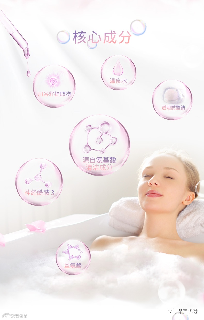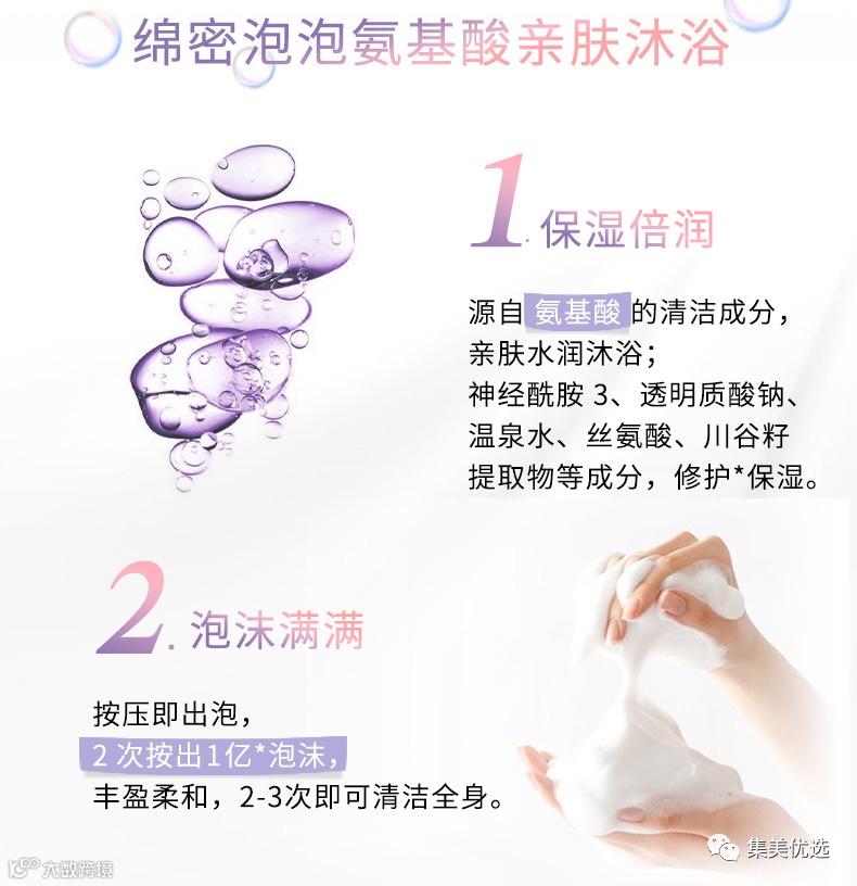 源自氨基酸的清洁成分(氨基酸表活),肌肤清洁温和且亲肤,带走污垢的同时呵护娇嫩肌肤。3CC大孔径泵头,按压2回即可产生1亿个泡沫,绵密细腻,更有助于减少对肌肤表面的摩擦和刺激。多重保湿精华:神经酰胺3、透明质酸钠、温泉水、川谷籽提取物、丝氨酸,保湿润泽。