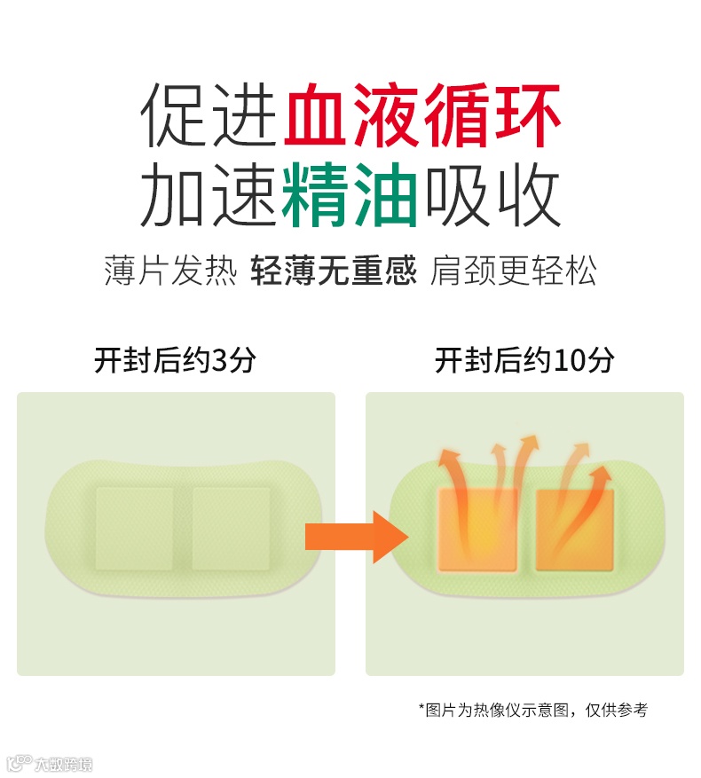 ???打开就能闻到淡淡的艾草味,是因为肩颈贴中添加了艾草精油,艾草有温经、去湿、散寒等功效,植物辅助调理肩颈,更健康。热敷可以打开人体毛孔,加热艾草精华,达到艾灸理疗效果,深层渗透活血通络。肩颈贴面部轻薄透气,不会有闷热感。