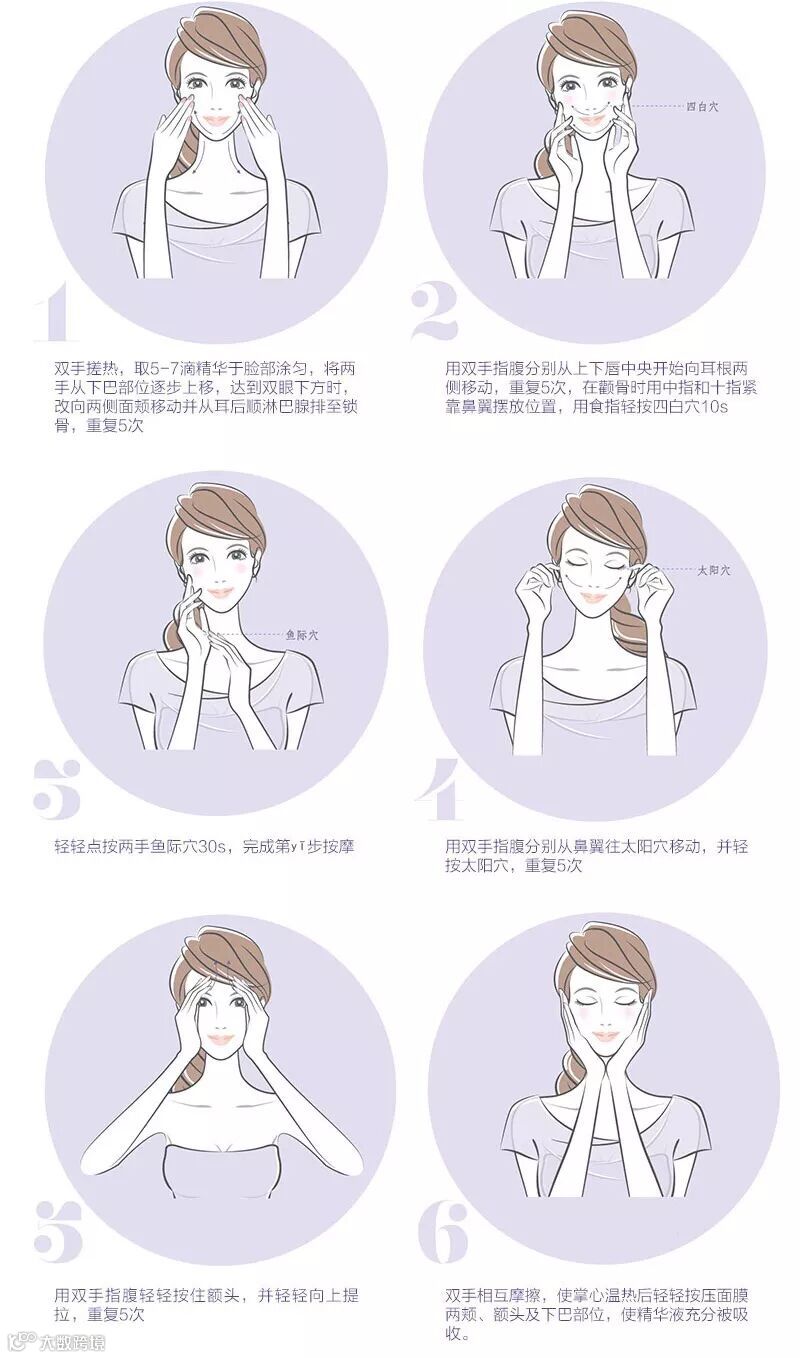 1、双手搓热,取5到7滴精华滴于面部涂匀,将两手从下巴部位逐渐上移,达到双眼下方时,改向两侧面颊移动,并从耳后顺淋巴腺排至锁骨,重复五次。