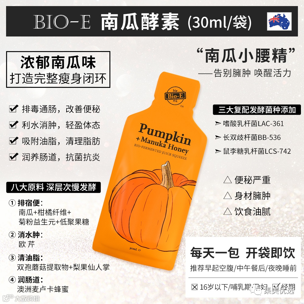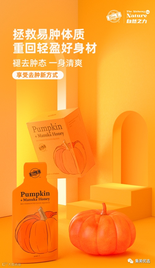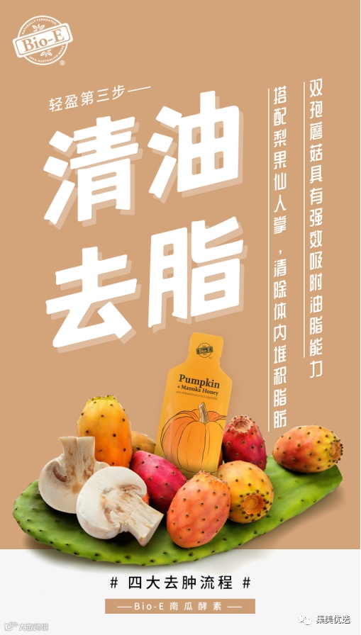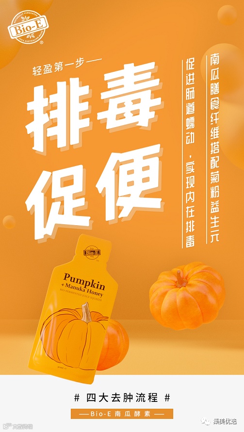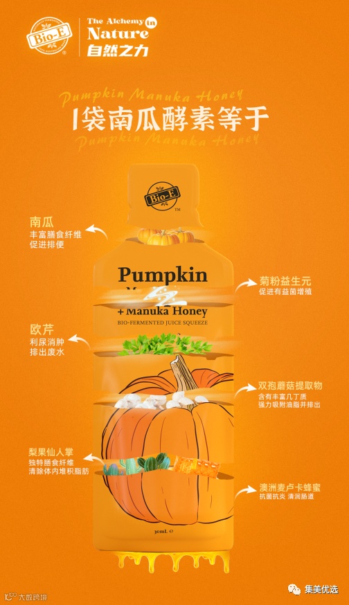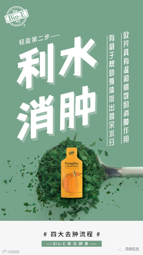 【特点】Bio-E南瓜酵素特别制定了一套完整的瘦身逻辑,首先将“排毒促便”作为第一步,清除出人体囤积的宿便;第二步则是“利水消肿”,加速人体排出多余废水,改善由于喝水过多、长期久坐等原因所造成的水肿问题。