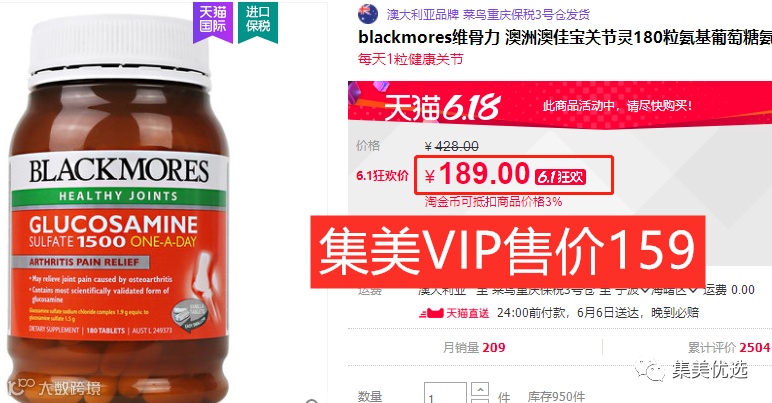 【大牌团购】Blackmores澳佳宝氨基葡萄糖氨糖维骨力关节灵180粒/瓶澳洲进口 原价:189元 VIP /黑卡M1会员 福利补贴价:159元 ![]()