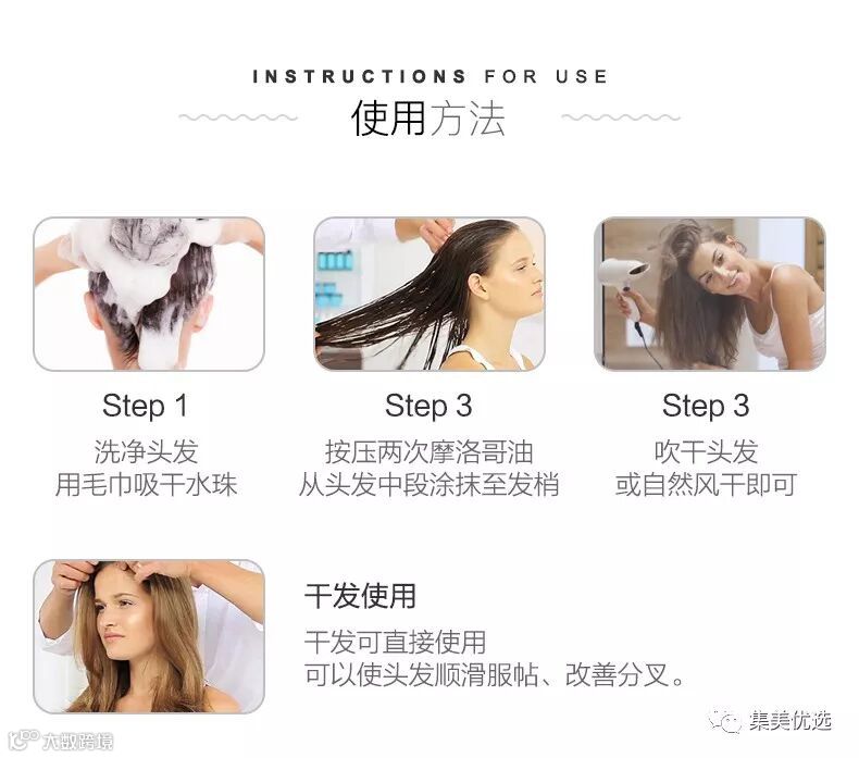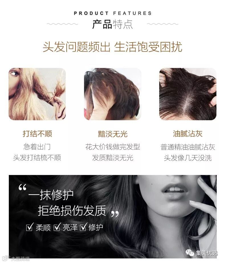 抚平毛躁:强大的抗氧化剂富含维他命,可有效修护毛鳞片,滋养角质层,抚平毛躁,保护头发避免外在损伤;并能瞬间增亮发丝,顺滑头发,给予头发光泽和质感。