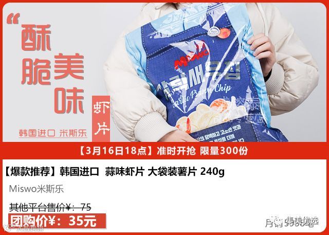 韩国进口米斯乐虾片,口感鲜美,“虾”味无穷。更 有浓郁的蒜香扑面而来,吃起来酥脆可口,韩国进口,分量十足。这是款有内涵的虾片,外出旅行、休闲、聚会不二的选择哦!