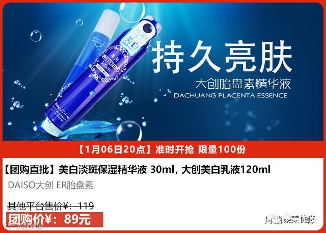 日本大创DAISO美白精华内含胎盘素,搭配独特的珍珠提取液。可以快速渗透肌肤,并被肌肤慢慢吸收达到效果显著的深层美白淡斑功效!珍珠提取液能够有促进细胞分裂~有效帮助肌肤找回年轻状态,让你拥有健康年轻态的完美肤质!