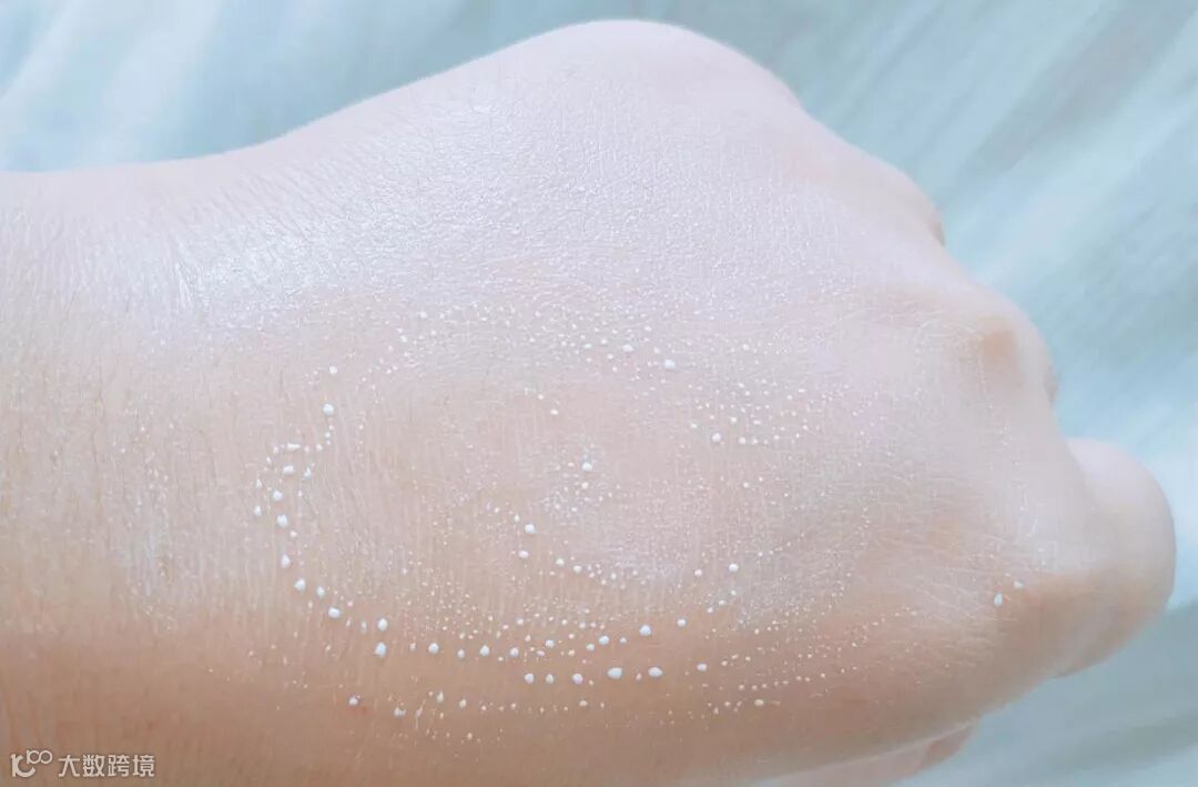 爆奶霜剔透的膏体涂抹在肌肤上之后,经过手指轻轻按揉,就会释放出一颗颗乳白色奶珠,即羊奶精华液,也就是“爆奶”效果啦