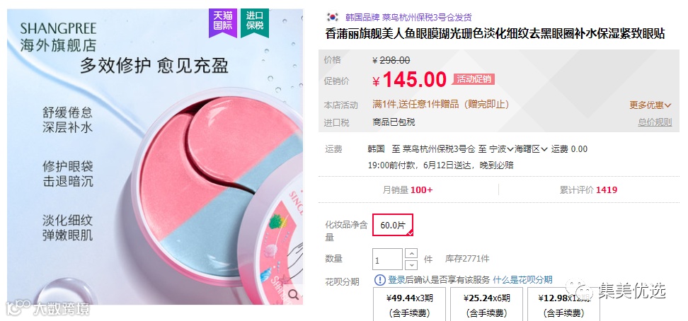 【大牌团购】韩国香蒲丽眼膜美人鱼眼膜贴60片 原价:89元 大牌团购价:59元 眼周肌肤缺水,干纹细纹增生???集美给各位小仙女们,带来了颜值超高的秘密美眼武器,香蒲丽 30周年定制款美人鱼眼膜贴!