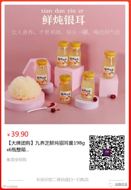 【大牌团购】九养芝鲜炖银耳羹198gx6瓶整箱 原价:69元 大牌团购价:39.9元 九养芝鲜炖银耳羹,开盖即食,下火润肺又养颜!可以天天喝的“平民燕窝”!