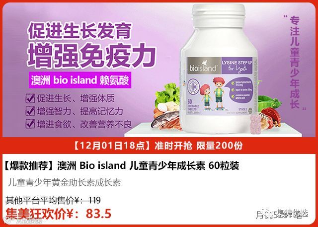 【Bio island助长素黄金成长素】营养强化剂,补充足够的赖氨酸能提高蛋白质的吸收和利用,达到均衡营养,促进生长发育。好处多多:1.提高智力,促进生长,身高增加,体重增加 2.增加食欲增强体质,改善营养不良状况 3.帮助产生抗体,提高免疫力,提高减少感染疾病几率~