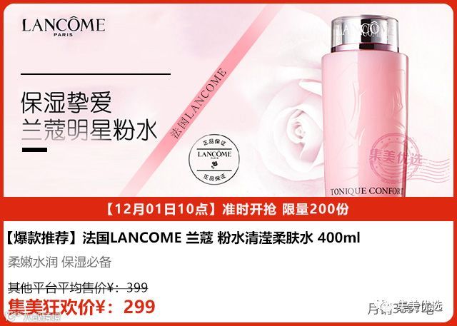 这是一款能让肌肤“喝饱”水的化妆水,传说中的兰蔻清滢柔肤水,含有玫瑰精华成分!在爽肤的同时还能够起到舒缓肌肤,保持肌肤润泽的功效。兰蔻粉水的质地比较粘稠,很快就可以被吸收,尤其适合肤质偏干肤质,绝对是值得一试哦~