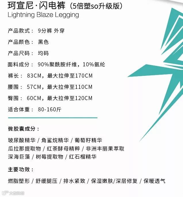 它是采用法国先进的美妆微胶囊技术,将近10种燃脂纤体、美肤抗衰老的天然植物成分,固定附着在闪电裤面料上。