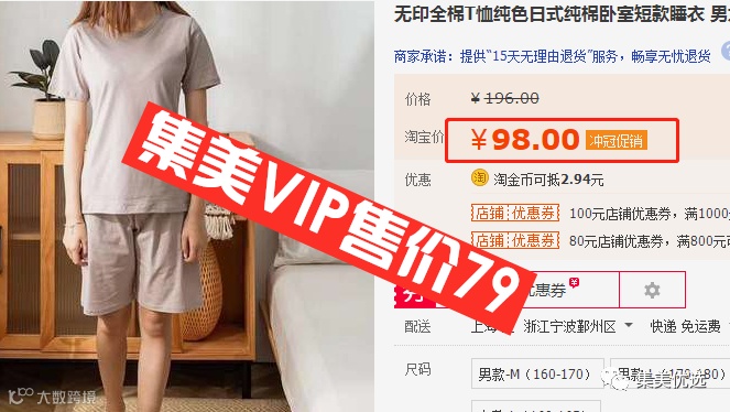 【大牌团购】无印全棉T恤纯色日式纯棉卧室短款睡衣 男女士情侣家居服套装夏季 原价:98元 VIP /黑卡M1会员 福利补贴价:79元 无印睡衣回购率超高,因为太好穿了,