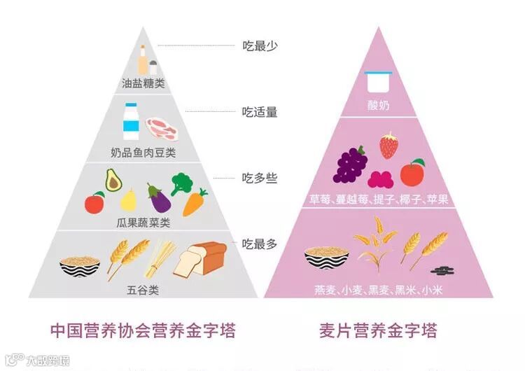 中国营养协会发布的《营养金字塔》,建议每人每天均衡摄入五谷杂粮、水果蔬菜、鱼肉豆制品、蛋奶等食物。 麦片配料含水果、奶制品和粗粮谷物,基本把金字塔的营养覆盖了。