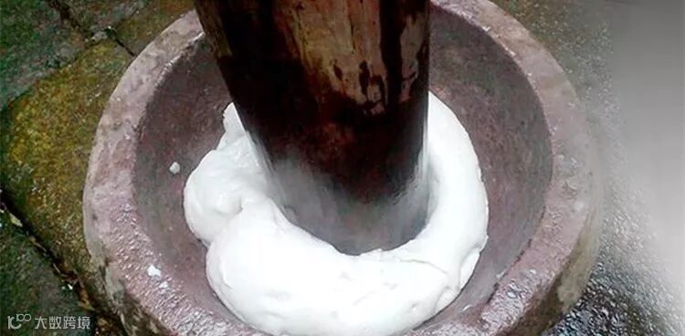 旁边一人用浸过水的手将石臼里的粉快速翻动,