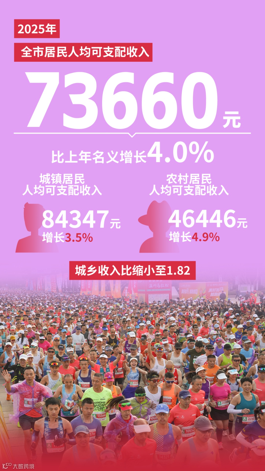 2025年,全市居民人均可支配收入73660元,比上年名义增长4.0%。按常住地分,城镇居民人均可支配收入84347元,比上年增长3.5%;农村居民人均可支配收入46446元,比上年增长4.9%。城乡协调加速推进,城乡收入比由上年的1.84缩小至1.82。“提低”步伐稳中有进,全市低收入农户人均可支配收入23815元,比上年增长11.0%。民生实事扎实推进,全年民生支出占一般公共预算支出比重79.2%。