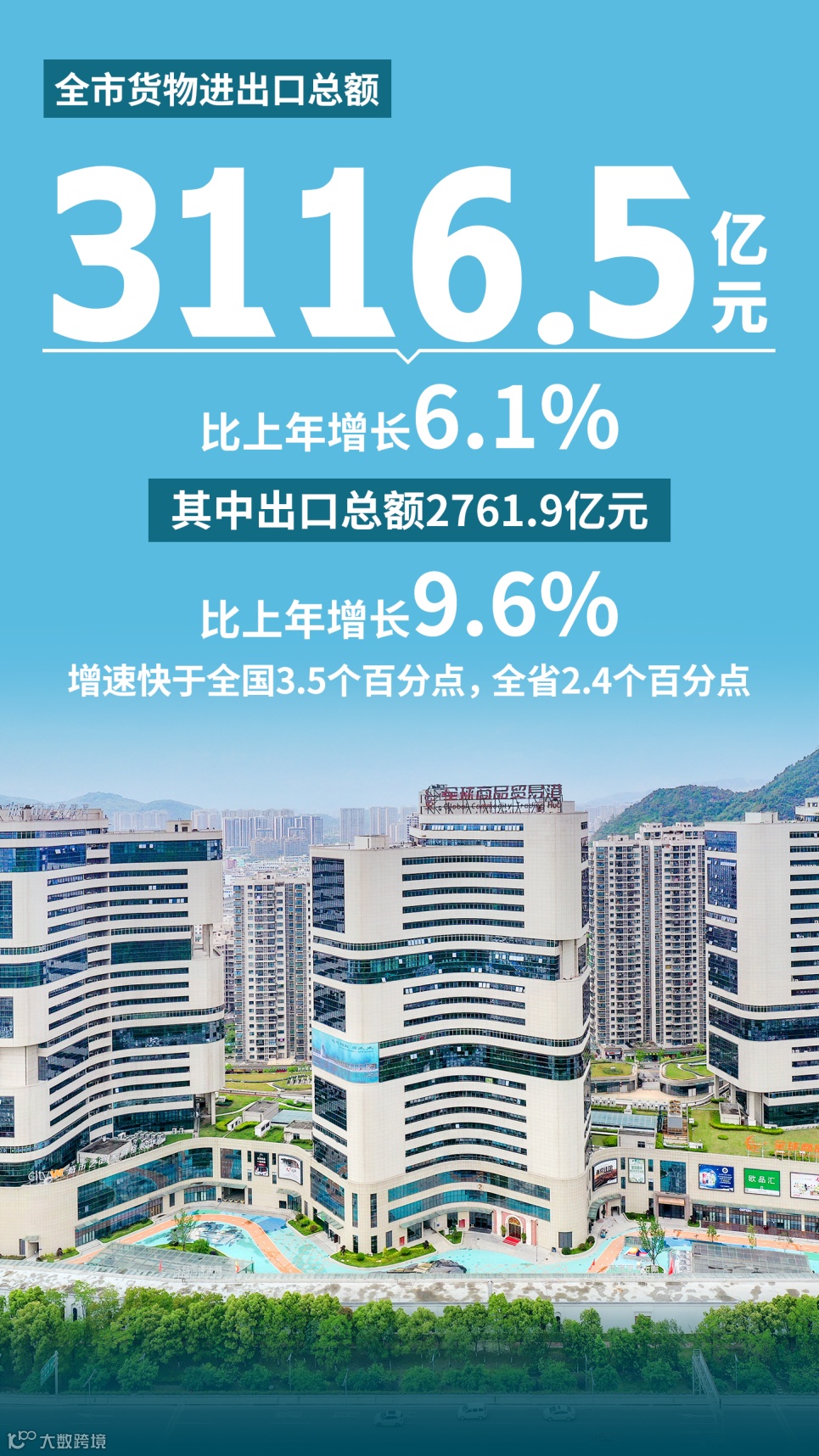 2025年,全市货物进出口总额首破3000亿元,为3116.5亿元,比上年增长6.1%,其中出口额比上年增长9.6%,增速分别快于全国、全省3.5和2.4个百分点。国际贸易“朋友圈”不断扩大,出口市场更加多元,贸易伙伴覆盖237个国家和地区,对共建“一带一路”国家、东盟、中东出口额分别比上年增长13.4%、16.8%、18.0%。出口结构继续优化,机电产品、高技术产品出口额分别比上年增长11.6%、32.9%。民营经济保持活力,民营企业出口额2655.3亿元,比上年增长11.4%;占全市出口比重96.1%。