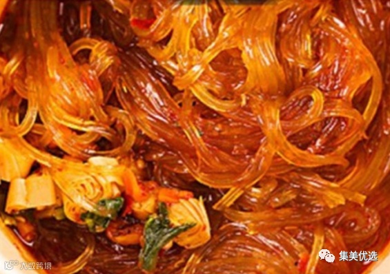 它采用正宗红薯粉为原料,使用深井矿泉水,泡出来的水晶粉丝,具有晶莹透亮软滑筋道不混汤、不断条的特点。