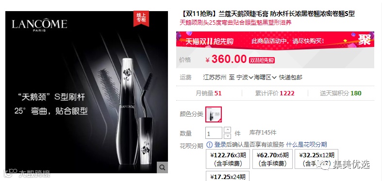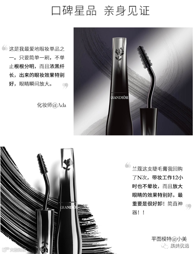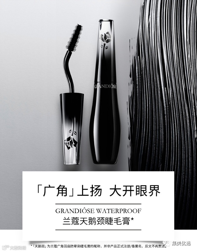 【大牌团购】兰蔻 广角羽扇防晕染睫毛膏10g 原价:360元 VIP /黑卡M1会员 福利补贴价:259元 这就是那个angelababy同款的睫毛膏,S型的刷杆就像天鹅颈一样,所以好多人都直接叫它天鹅颈睫毛膏。