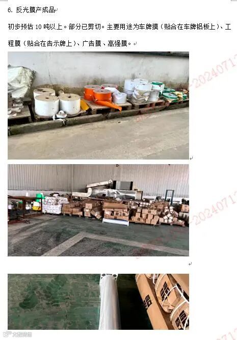 1. 离型纸2. 聚脂薄膜3. 黄板纸箱、木托盘、木托板4. 装饰纸5. 反光膜半成品6. 反光膜产成品7. 复合膜 [40吨]