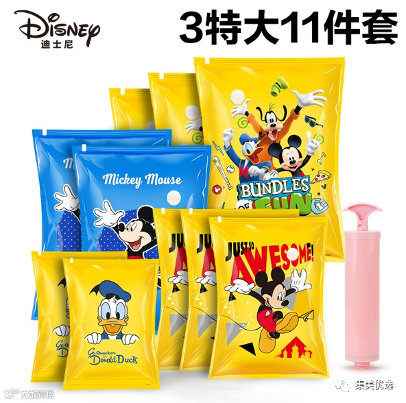 【限时秒杀】迪士尼真空压缩收纳袋11件套 原价:79元 VIP /黑卡M1会员 福利补贴价:49元 天气渐凉,秋冬换季 夏天的衣服也要放起来了 迪士尼的“小可爱们”向你家出发啦! 迪士尼压缩收纳袋复团啦 带给每个拥有童梦的家庭 有效防止衣服发霉受潮,安稳存放过季衣物