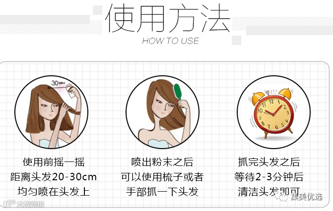 在头顶的地方对着头皮喷几下,再用吹风机吹,这时候头发就会立刻蓬松起来,特别适合头皮容易出油,或者早上起晚了没时间洗头的情况!