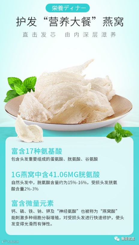 BNP蛋白质萃取科技:将燕窝水解成胜肽结构,完整保留燕窝中珍贵的唾液酸,并将其添加到发膜中,渗透秀发直至基底层,修护发芯。