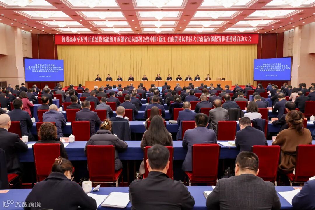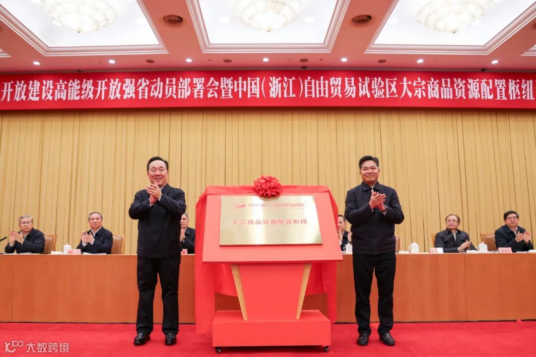 12月4日,推进高水平对外开放建设高能级开放强省动员部署会暨中国(浙江)自由贸易试验区大宗商品资源配置枢纽建设启动大会在杭州召开。省委书记、省长王浩和商务部副部长盛秋平共同为中国(浙江)自由贸易试验区大宗商品资源配置枢纽揭牌。