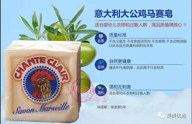 意大利原装进口Chante Clair 大公鸡头管家马赛 婴儿洗衣皂 肥皂,洗衣常备皂,白T,白衬衫、白袜子白抹布洗不干净?擦上鸡头皂放置一段时间再洗就白净了,比起国内的肥皂去污能力是强太多了!固体马赛皂手洗衣物最理想的选择。天然配方.富含脂肪酸.温和洗护!