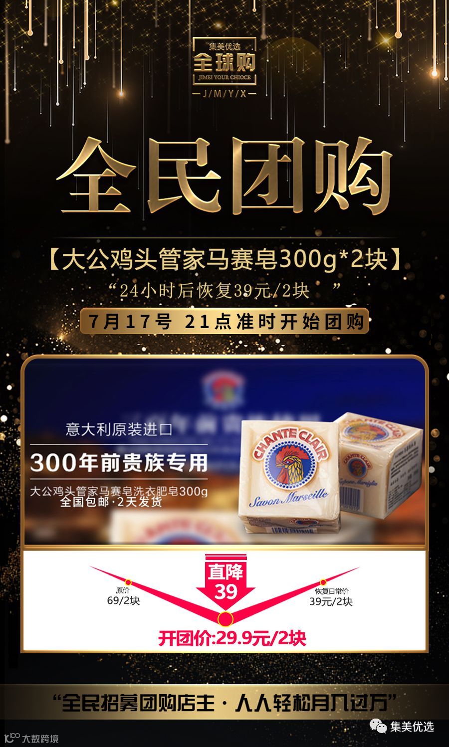 福利团购 意大利Chante Clair大公鸡头管家马赛皂洗衣肥皂300g*2块